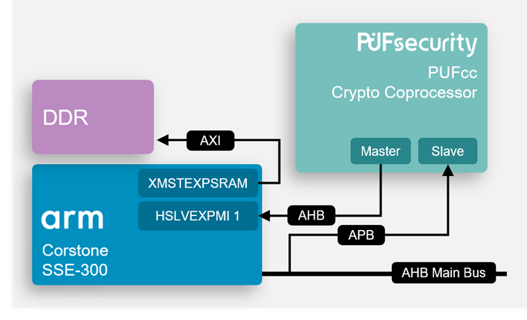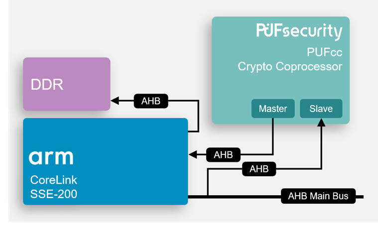 For integration with the CoreLink SSE-200 subsystem, PUFcc uses both AHB and APB buses for connections. PUFcc’s AHB master is linked to the CoreLink SSE-200 Manager Security Controller (MSC) for sending requests to Implementation Defined Attribution Units (IDAU) as required for PUFcc operation, such as external memories that are accessed through PUFcc’s Direct Memory Access (DMA) module. The APB slave bus module is connected to CoreLink’s Peripheral Protection Controller (PPC) to receive both secure and non-secure requests from the CoreLink SSE-200, as part of the Expansion 1 Interface.