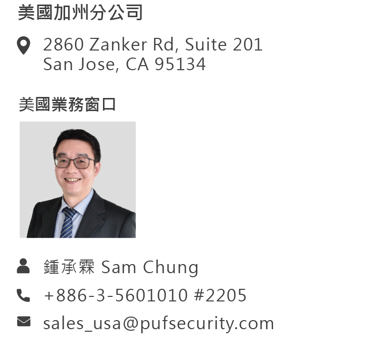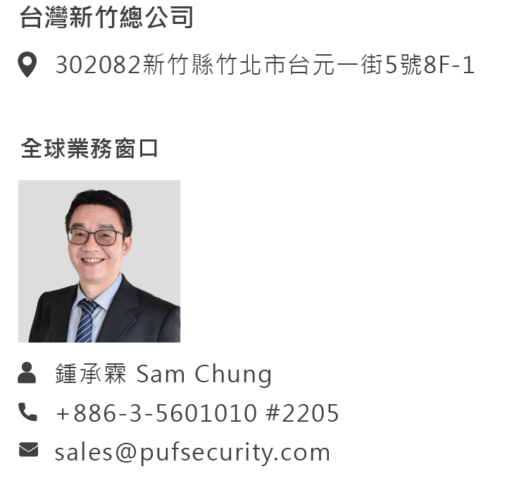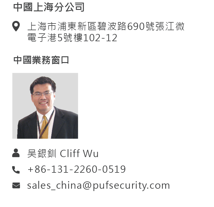聯絡我們For any questions or request for information about hardware security IP 台灣新竹總公司 +886 35601010 [email protected] 302082台灣新竹縣竹北市台元一街5號8樓之一 美國業務窗口 鄒定宇 John Chou +1 408-205-2920 [email protected] 台灣業務窗口 鐘承霖 Sam Chung +886 35601010 #2205 [email protected] 中國業務窗口 吳銀釧 Cliff Wu +886-3-5601168 [email protected] 媒體公關窗口 李柔萱 Erin Lee +886-3-5601010 #2102 [email protected]